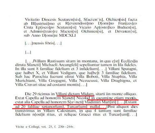 The third document is from the report of the Archbishop of Tivat Francesco Leonardi on 14. 10. 1642 where he says: “Vladimir is among the holy martyrs and his solemnity is celebrated by all believers, especially by those who are near Shkodra around a mountain where his Church is located on May 22.” (photo 3)