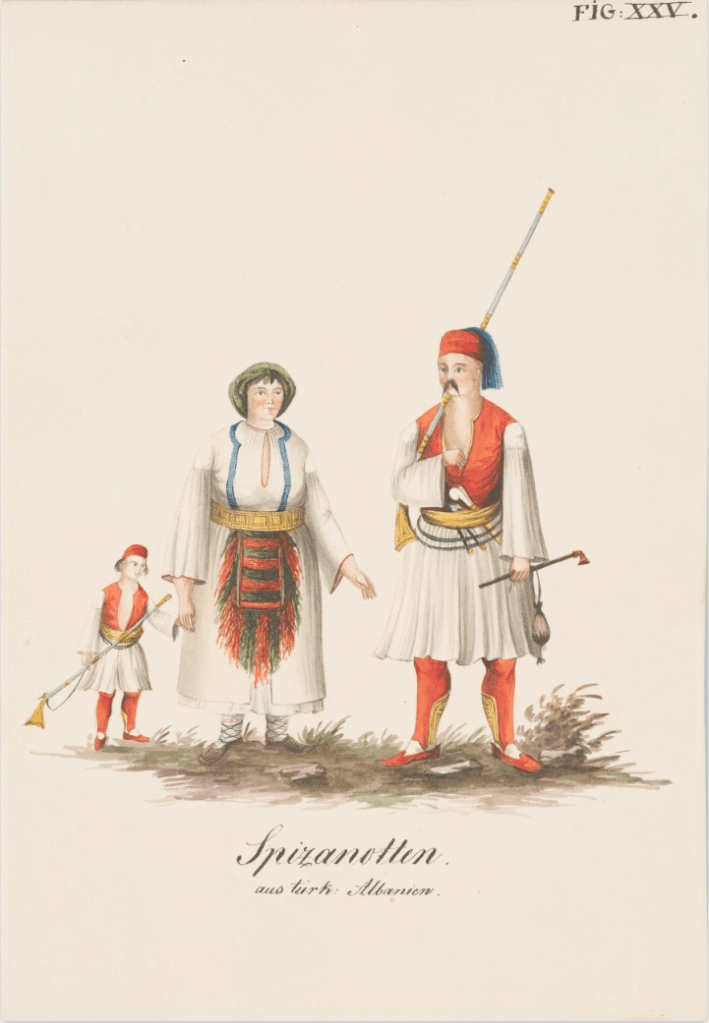 Albanian inhabitants of Spiç (Spizanotten – Spiçanë – Spizza) from Turkish Albania (at that time under Ottoman occupation), by Fedor von Karacsay (Hungarian soldier, cartographer and painter) published in 1842.