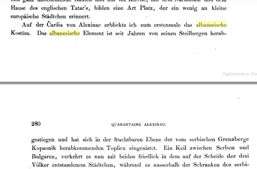 “In the Čaršia of Aleksinac I saw for the first time the Albanian costume. The Albanian element has for years descended from its rugged mountains and settled in the fertile plain of Toplica, which descends from the Serbian border mountain Kopaonik. A wedge between the Serbs and Bulgarians, it now treats both peacefully in the small town that arose on the dividing line of the three peoples, while beyond the borders of the Serbian border it is hostile to its Christian neighbors.”