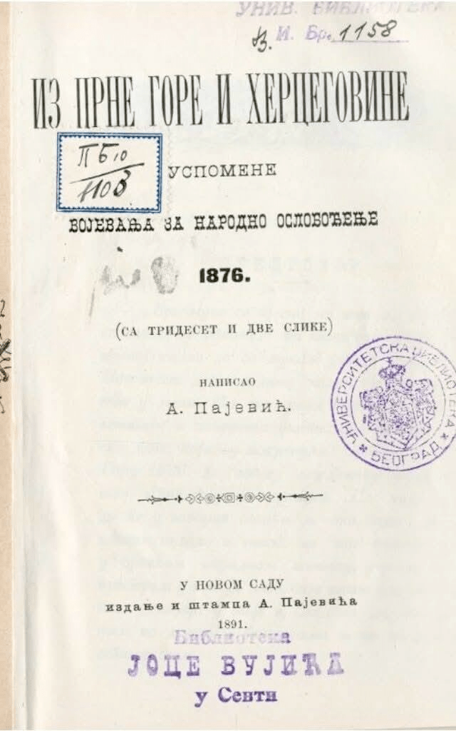 UNIV. LIBRARIES V.M. No. 1158. FROM CRNA GORA AND HERZEGOVINA. MEMORIES WARS FOR NATIONAL LIBERATION 1876. 2 (WITH THIRTY-TWO PICTURES) WRITTEN By A. Pajevic. U NOVI SAD edition and printing by A. Pajević 1891. Library of JOCA VUJIĆ in Senta. p.378