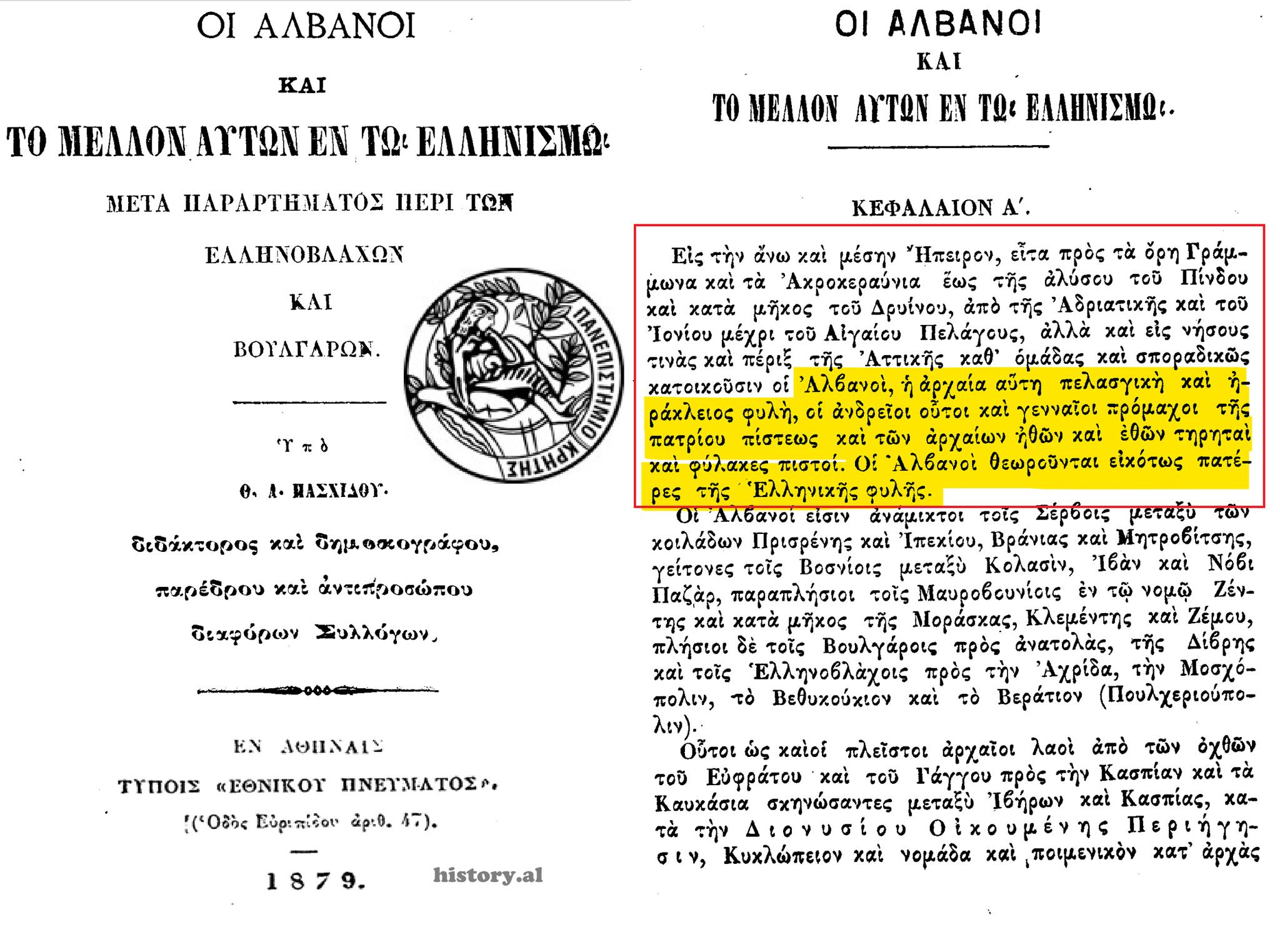 “…the Albanians, this ancient Pelasgian and Heracleian tribe, these brave and brave defenders of the faith of their homeland and the ancient customs and traditions, adherents and faithful guardians. The Albanians are considered the fathers of the Greek race.”