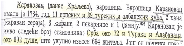 Fig. 1. Evidence from Serbian literature, that in 1784, Kraljevo had only 11 Serbian and 89 Albanian houses.