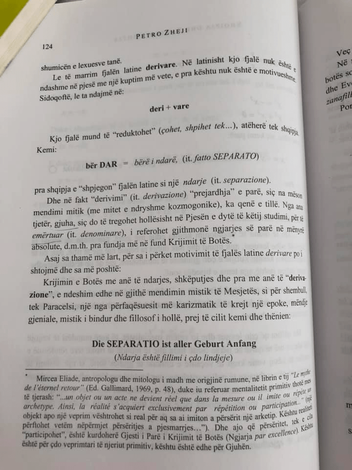 “Let’s take the Latin word derivare. In Latin, this word is not divisible into parts with a separate meaning, so it is not motivated. However, let’s break it down into:deri + limeThis word can be “reduced” (cohet, sphihet to…), then in Albanian we have:do DAR = made separate, (it. fatto SEPARATO)so Albanian “explains” the Latin word as a separation (it. separazione).