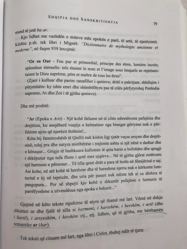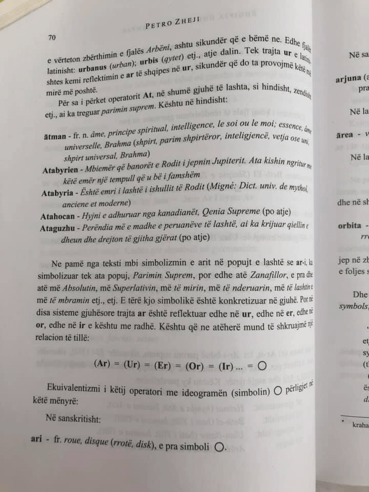 “… proves the breakdown of the word Arbëni, just like we did. Also Latin sentence: urbanus (urban); urbis (city), etc., appear there. In the additional Latin form ur, we have the reflection of the Albanian ar in ur, as we will prove this better below.As for the At operator, in many ancient languages, such as Hindi, Zendish, etc., it has indicated the supreme principle.