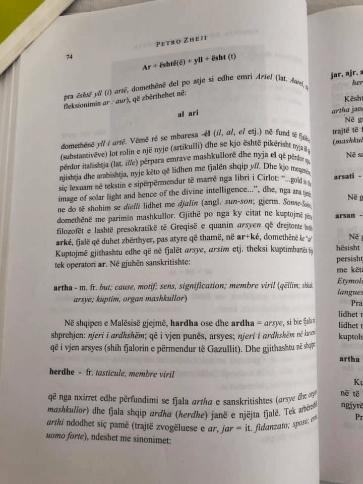 We also understand that in the words reason, education, etc., the meaningful emphasis is on the operator ar. In the Sanskrit language:artham Fr. soft; cause, motive; sens, signification; virile member (purpose; cause reason; meaning, male organ)In the Albanian of the Highlands we find, hardha or and ardha = reason, as the word says the expression: future man; that comes to work, reason; the next man in the council who comes to reason (see Gazulli’s mentioned dictionary).