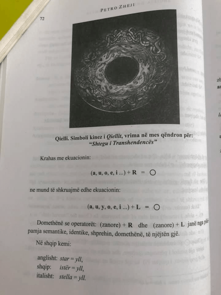 “The sky. The Chinese symbol for Heaven, the hole in the middle stands for: “The Path of Transcendence” Along with the equation: (a, u, o, e, i…) + R = O we can also write the equation: (a, u, y, o, e, i …) + L = O That is to say that the operators: (vowel) + R and (vowel) + L are semantically identical, they express, that is, the same thing. In Albanian we have: English: star = star, Albanian: istar yll, Italian: stella = star.”