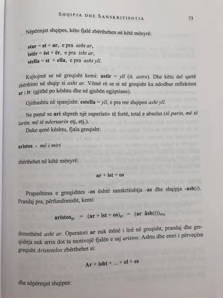 Also in Spanish: estella = star, well in Albanian asht yll.We saw that gold expresses a strong, total and absolute superlative (the first, the highest, the most honorable, etc., etc.).That being so, the Greek word:the best aristosbreaks down like this:ar + ist + osThe suffix of Greek -os is Sanskrit -as and Albanian -ash(t). Therefore, finally, we have:aristosgr. (ar+ist+os)gr. (you have(t))shq.that is, it is gold. The operator ar is not free in Greek, and therefore the Greek cannot motivate its word aristos. Likewise, the Greek proper name Aristotelos breaks down as:Ar+isht + … + el + esand through Albanian: .. “