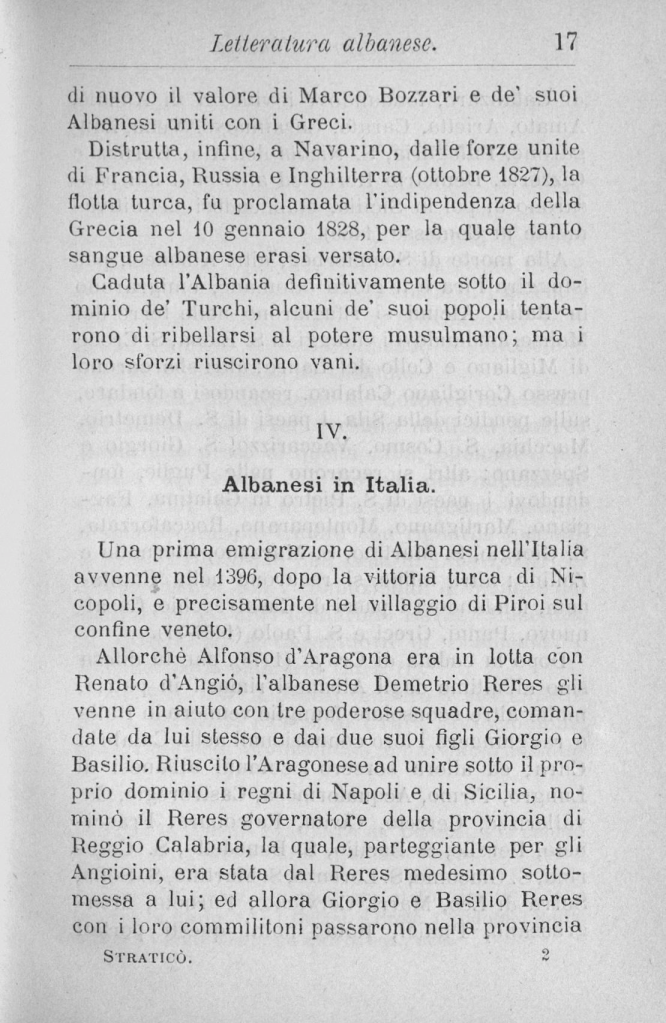 When Alfonso of Aragon was fighting with Renato d’Angiò, the Albanian Demetrio Reres came to his aid with three powerful squadrons, commanded by himself and his two sons Giorgio and Basilio. When the Aragonese succeeded in uniting the kingdoms of Naples and Sicily under his own dominion, he appointed Reres governor of the province of Reggio Calabria, which, siding with the Angevins, had been subjected to him by Reres himself; and then Giorgio and Basilio Reres with their comrades crossed over to the province of STRATICO”.