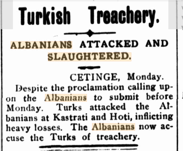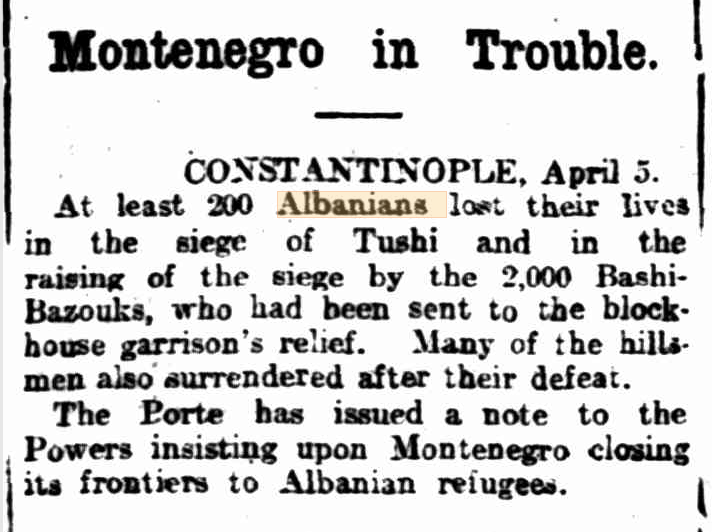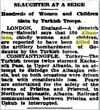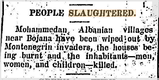 “ALBANIANS MASSACRED. 1907 LONDON, Monday. Two thousand Montenegrins crossed the Turkish frontier and massacred the inhabitants of two Albanian villages near Gusinjo.”3