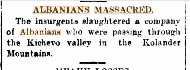 “The insurgents slaughtered a company of Albanians who were passing through the Kichievo valley in the Kolander Mountains.”2