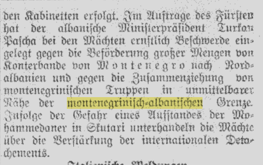 On behalf of the Prince, the Albanian Prime Minister, Turfon Pasha, has seriously complained to the Powers about the transport of large quantities of contraband from Montenegro to northern Albania and about the concentration of Montenegrin troops in the immediate vicinity of the Montenegrin-Albanian border. Due to the danger of an Albanian uprising in Scutari, the Powers are negotiating to reinforce the international detachments.”