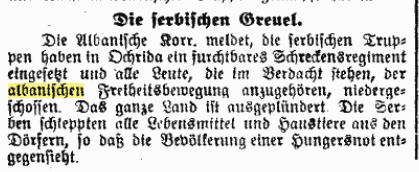 “The Serbian atrocities. The Albanian Correspondent reports that Serbian troops have launched a terrible reign of terror in Ohrid and shot down all those suspected of belonging to the Albanian Freedom Movement. The entire country has been plundered. The Serbs have stolen all food and domestic animals from the villages, so that the population is facing famine”.