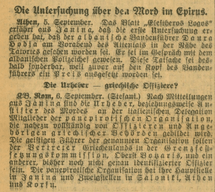 KB. Rome, September 6. (Stefani.) According to reports from Janina, the perpetrators, or rather instigators, of the murder of the Italian delegation are members of the Pan-Epirotic organization, which is made up almost entirely of officers and members of the Greek authorities. The spiritual leaders of this organization are said to be the Greek representative on the Border Fortification Commission, Colonel Boyaris, and another officer who has not yet been precisely identified. The Pan-Epirotic organization has its headquarters in Janina and branches in Salonika, Athens, and Corfu.”