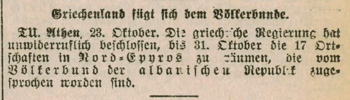 «Η Ελλάδα υποτάσσεται στην Κοινωνία των Εθνών. TU. Αθήνα, 28 Οκτωβρίου. Η ελληνική κυβέρνηση αποφάσισε αμετάκλητα να προσαρτήσει έως τις 31 Οκτωβρίου τα 17 χωριά στη Βόρεια Ήπειρο, τα οποία η Κοινωνία των Εθνών έχει παραχωρήσει στην Αλβανική Δημοκρατία».