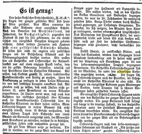 “An energetic step by Austria-Hungary would also be greeted with joy by Catholics all over the world. The entire civilized world looks with concern and fear at the sad future that awaits the Catholics of Albania under the rule of Montenegro and Serbia. An energetic approach on the part of the protectorate power of Austria-Hungary will be welcomed by the whole world as a liberation”