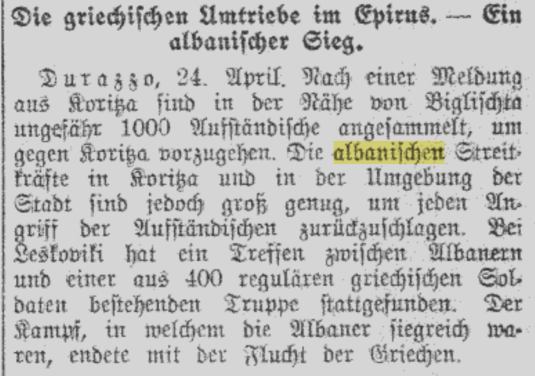 “The Greek machinations in Epirus. – An Albanian victory. Durazzo, April 24. According to a report from Korcë, approximately 1,000 insurgents have gathered near Biglishta to advance against Korcë. However, the Albanian forces in Korcë and the surrounding area are large enough to repel any insurgent attack. A meeting took place near Leskoviki between Albanians and a force of 400 regular Greek soldiers. The camp, in which the Albanians were victorious, ended with the Greeks fleeing”.