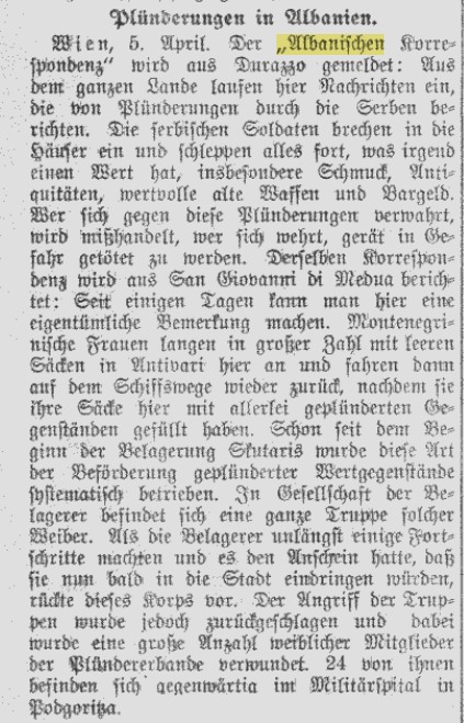 “Looting in Albania. Vienna, April 5. The “Albanian Correspondence” receives a report from Durazzo: News is coming in from all over the country reporting looting by the Serbs. The Serbian soldiers are breaking into the shops and carrying off everything of any value, especially junk, antiques, valuable old weapons, and cash. Anyone who protests against this looting is mistreated; anyone who resists is in danger of being killed.”
