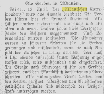 “The Serbs in Albania. Vienna, April 19. The “Albanian Correspondence” reports from Kawaja: The Serbs are maintaining a strict regime here. All houses have been searched several times, and all old and new weapons, as well as many valuables, have been confiscated from the owners. Food has also been confiscated.