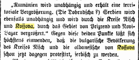 “Serbia also becomes independent and is enlarged by the districts of Nish and Kosova, by the area of Prizren and Novi Pazar. The most that can be objected to these two points is that the Bulgarian population of the district of Nish and the Albanian population of Kosova are already protesting against becoming Serbian.”