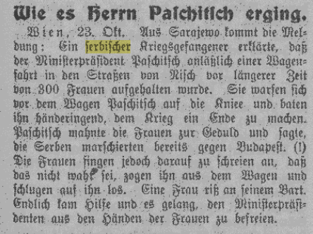 Vienna, 23rd. Often. From Sarajevo comes the report: A Serbian prisoner of war explained that Prime Minister Pasic was stopped by 300 women some time ago during a carriage ride through the streets of Nish. They threw themselves on their knees in front of Pasic’s carriage and begged him with desperate hands to end the war.
