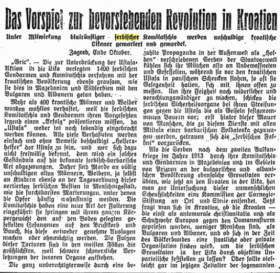 “Gric.” – The 1,400 Serbian gendarmes and komitadjis deployed to Lika to suppress the Ustasa action are treating the Croatian population just as cruelly as they treated the Bulgarians and Albanians in Macedonia and southern Serbia.