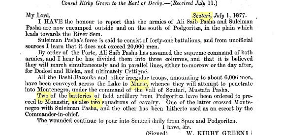 “The English consul in Shkodra describes the fighting in the west of Kraja between Montenegrin and Ottoman forces in July 1876. These fighting have been unknown in detail from our history. Based on this telegram that he sends to his superiors, he explains the circumstances of the fighting in Krrica, Shestan and Muriq. According to him, Ahmet Hamdi Pasha had sent a battalion of regular soldiers and 2000 volunteers with Catholic and Muslim (Albanian) peasants lightly armed to Muriq.