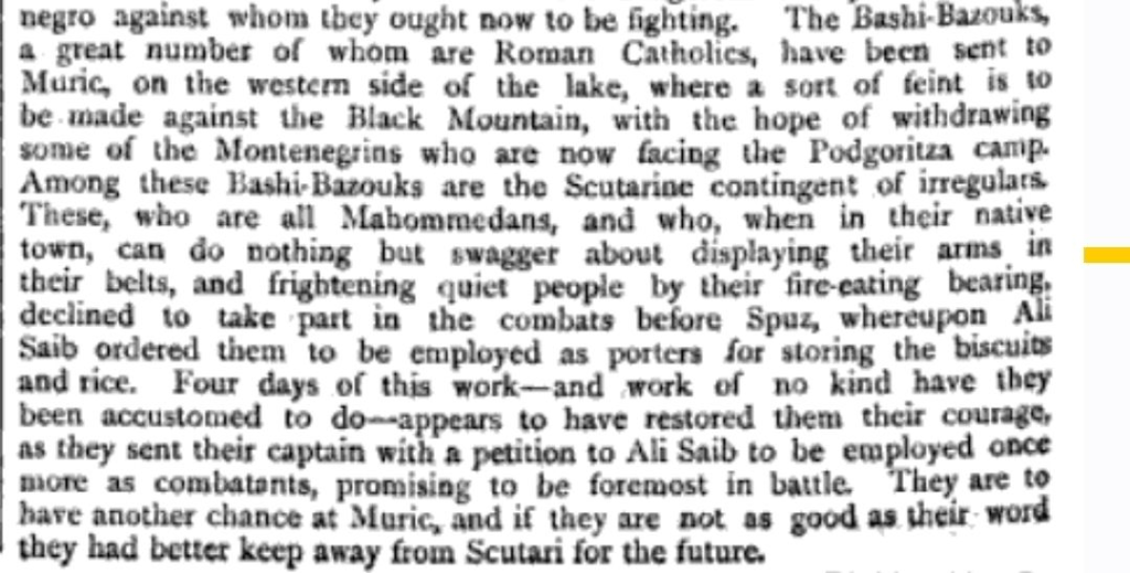 “The Bashi-Bazuks, a large number of whom are Roman Catholics, have been sent to Muriq, on the western side of the lake, where a sort of deception is to be carried out against Montenegro, in the hope of drawing away some of the Montenegrins who are now facing the Podgorica camp.