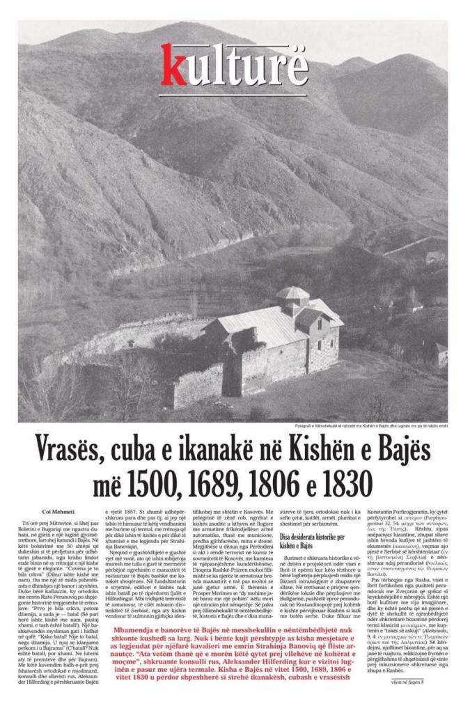 “Three hours from Mitrovica, as Boletini and Bugariqi were left behind with their smokestacks, in the middle of a semi-circular valley, the village of Baja rose. In this idyll of 50 houses that seemed like a haven for the foreign traveler, the ruins of a large and elegant church still stood out from the eastern side. “It was a famous church once,” said a local resident in a voice between sighs and pain.
