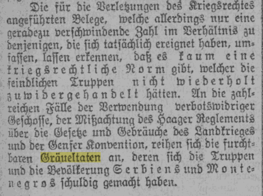 The evidence cited for the infringements of martial law, which, however, represent only a negligible number compared to those that actually occurred, shows that there is hardly a norm of war law that enemy troops have not repeatedly violated. The numerous cases of the use of prohibited ammunition, the disregard of the Hague Regulations on the Practices and Customs of War on Land and the Geneva Convention, are followed by the fearsome atrocities of which the troops and population of Serbia and Montenegro are guilty.”
