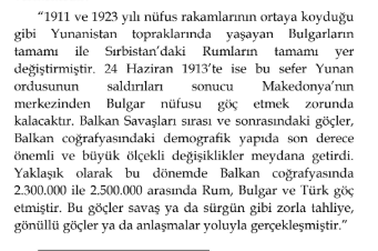 “As the 1911 and 1923 population figures reveal, all Bulgarians living in Greece and all Greeks in Serbia were displaced. On June 24, 1913, the Bulgarian population was forced to emigrate from central Macedonia as a result of attacks by the Greek army. Migrations during and after the Balkan Wars brought about extremely significant and large-scale changes in the demographic structure of the Balkans.