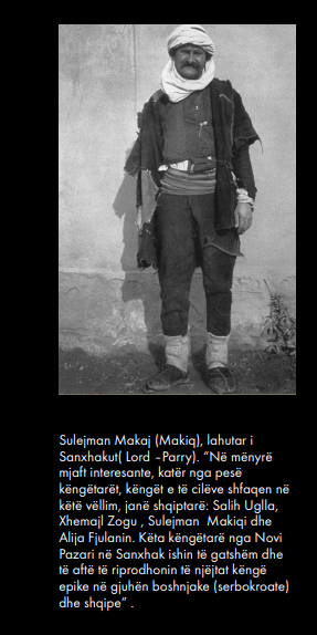 Sulejman Makaj (Makiq), lahutar of the Sandžak (Lord –Parry). “Interestingly, four of the five singers whose songs appear in this volume are Albanian: Salih Uglla, Xhemajl Zogu, Sulejman Makiqi and Alija Fjulanin. These singers from Novi Pazar in the Sandžak were willing and able to reproduce the same epic songs in Bosnian (Serbo-Croatian) and Albanian.”