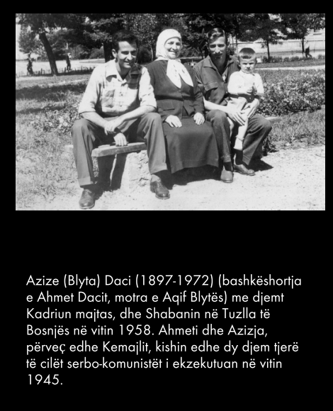 He was arrested in Gjakova and brought to the Pazar i Ri prison and was tortured cruelly for three weeks until his last moments, together with his son-in-law Ahmet Daci. Mahije Komoni Blyta, (1898-1980), wife of Aqif Blyta, comes from the Komoni family of Gjakova. Mahije Komoni Blyta (1898-1980), wife of Aqif Blyta, hospitalized after Aqif Blyta’s execution, had her house and all her property confiscated; she lived in poverty in a social housing. Aqif Blyta’s house, nationalized by the Serbian government, before it was demolished.