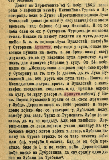 Letter from Herzegovina dated February 9th. In 1861, speaking about the quarrel between the Turks and Montenegrins of Nikšić, he says about Luka: “The proclaimed duke Luka Vukalović came back to his homeland at the very time when the battle was taking place near Nikšić. And since then he has been busy in Sutorina. He is very difficult for the Turks. They cannot see or hear him walking there.