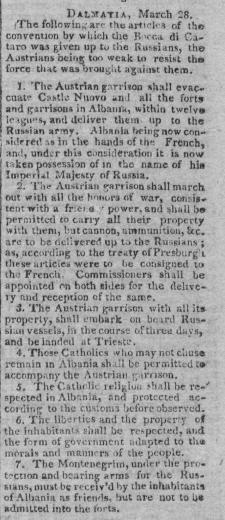 DALMATIA, March 28 [1806]. These are the points of the agreement by which the Bay of Kotor was surrendered to the Russians, since the Austrians were too weak to resist the forces that opposed them.