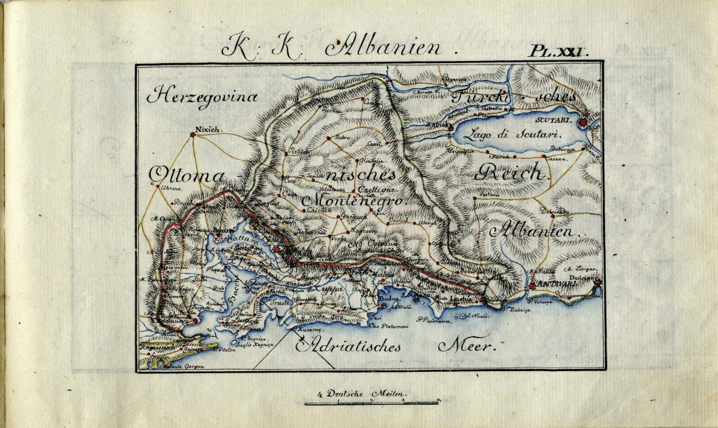 In 1805, a publication with maps of Kotor and Dalmatia was published titled “Cattaro Haupstadt Albaniens”. It shows the fortress of Kotor (Cattaro). The publication was written by Maximilian de Traux (1765-1817) and published in 1805. De Traux was a Colonel of the Austrian army and personally visited these areas in 1803.