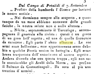 In the book “Osservatore del lago Trasimeno” from 1828, in the section “NOTIZIE DELLA GRECIA DELLA MOREA E DELLA GUERRA FRA LA RUSSIA E LA PORTA”, we can read that the Greek soldier Nikita Turkofagos (Νικήτας Σταματελόπουλος Τουρκοφάγος) was reported to have been dressed in an Albanian dress.