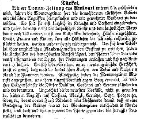 “As the Donau-Zeitung reports from Antivari under the 5th, the Montenegrins continue to raid the neighboring Turkish territories with their attacks and to devastate them with the utmost barbarity. Most recently they broke into Krniza and Sceslani (Shestan), and there they burned down the Catholic church and the Catholic rectory, along with 140 other houses, mostly inhabited by Catholics. Elderly people, women, and children who could not reach safety in the hills in time were inhumanely slaughtered.