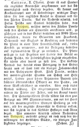 “Cattaro, October 2nd. Today an English commissioner arrived and went immediately to Cestinje (Cetinje). He comes from Constantinople and is the bearer of important documents for the English. The consul in Scutari and Prince Danilo, upon hearing that Halim Pasha of Scutari had decided to punish the Vasojevići tribe, who refused to recognize either the prince or the sultan as sovereign, and to invade the territory with 3,000 men, prompted the envoys of Austria and England to convene a conference. The Porte sent a friendly note requesting that conflict be avoided and a diplomatic settlement attempted.