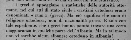 “The Greeks rely on statistics from the Ottoman authorities, in whose civil records Orthodox Christians were referred to as “Rum” (Greeks). But this means that they are of Orthodox religion, not of Greek nationality. And only by this means have the Greeks been able to find a certain majority in some parts of Albania. But in this way, there would be no Orthodox Albanians in Albania!”