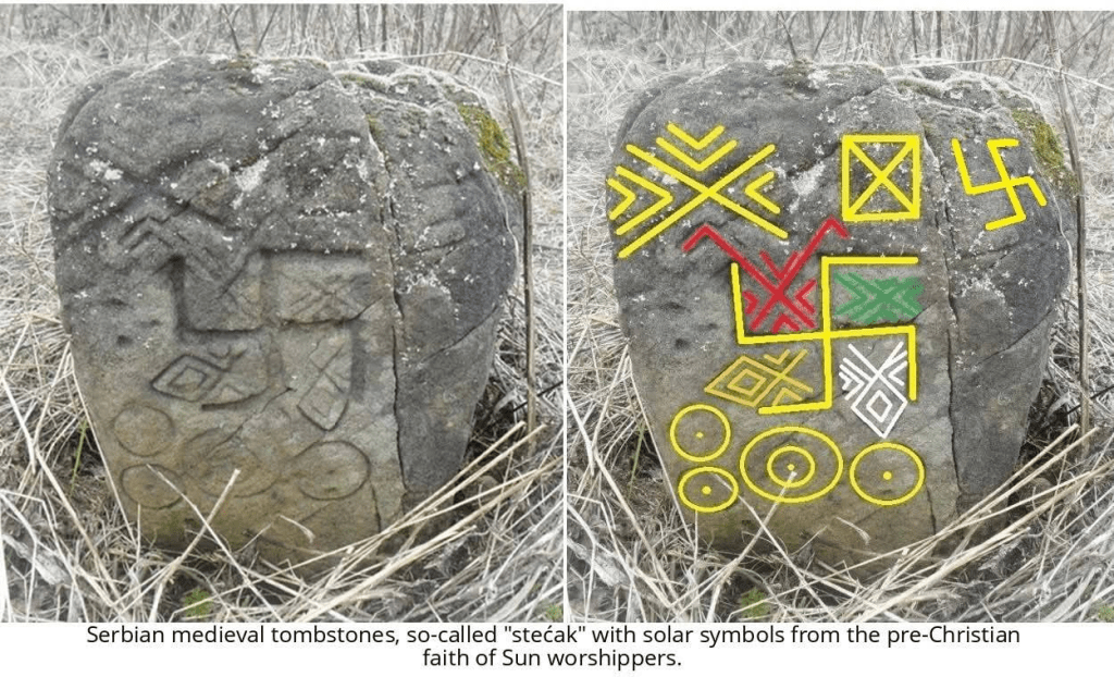 Pre-Slavic and Pre-Serbian medieval tombstones, so-called “stećak” with solar symbols from the pre-Christian faith of Sun worshippers.