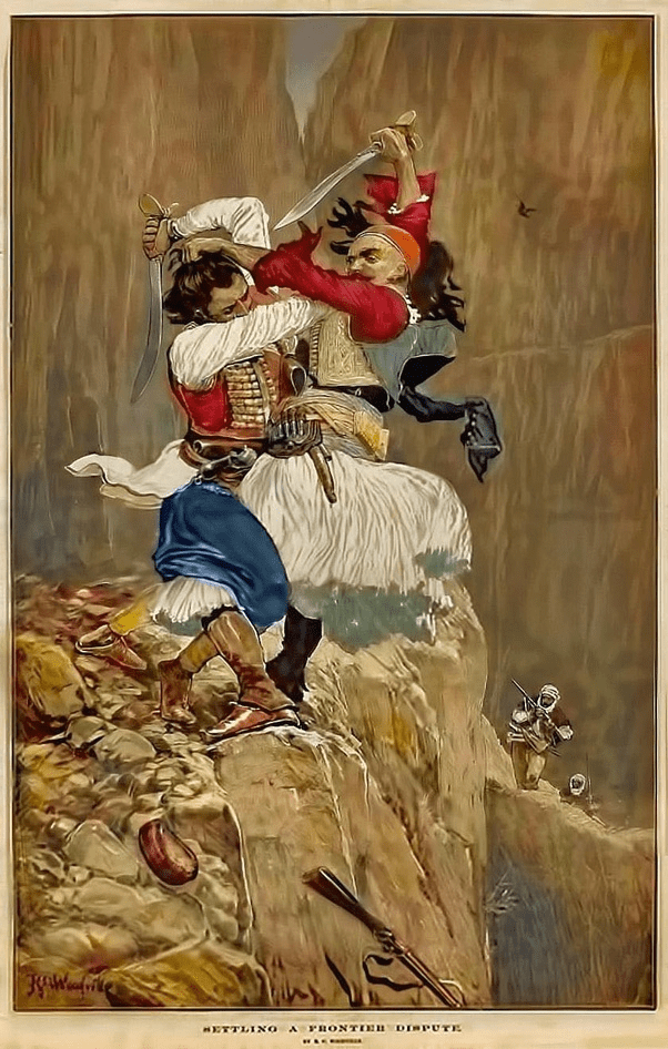 In the Museum of Athens, there is a painting titled “Suliot fighting a Turk during the Athens War”. However, this is Greek propaganda. The original is titled “Settling a Frontier Dispute “by Richard Caton Woodville, 1880 and depicts an Albanian fighting a Montenegrin.