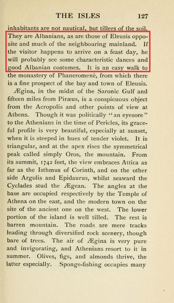 He further notes that Athens itself, despite its symbolic role as the heart of Hellenism, was surrounded by countryside “peopled by Albanians,” making the capital the best place in Greece to observe traditional costume precisely because of this Albanian hinterland.