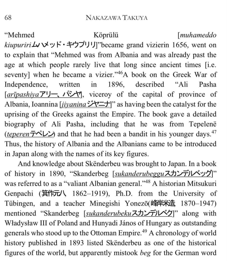 同書はアリ・パシャの詳細な伝記を与えており、彼がテペレナ(teperen テペレン)出身であったこと、また若年期には山賊であったことなどが含まれている。47 こうして、アルバニアおよびアルバニア人の歴史は、その主要人物の名とともに日本に紹介されたのである。