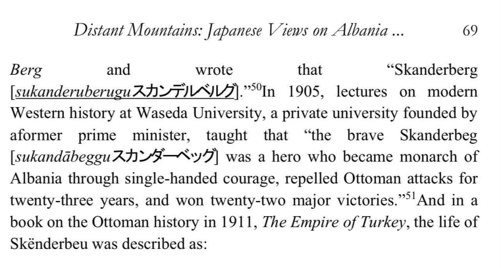 Knowledge of Skanderbeg was brought to Japan. In a history book in 1890, “Skanderbeg [sukanderubebgu]” was mentioned as a “brave Albanian general”.
