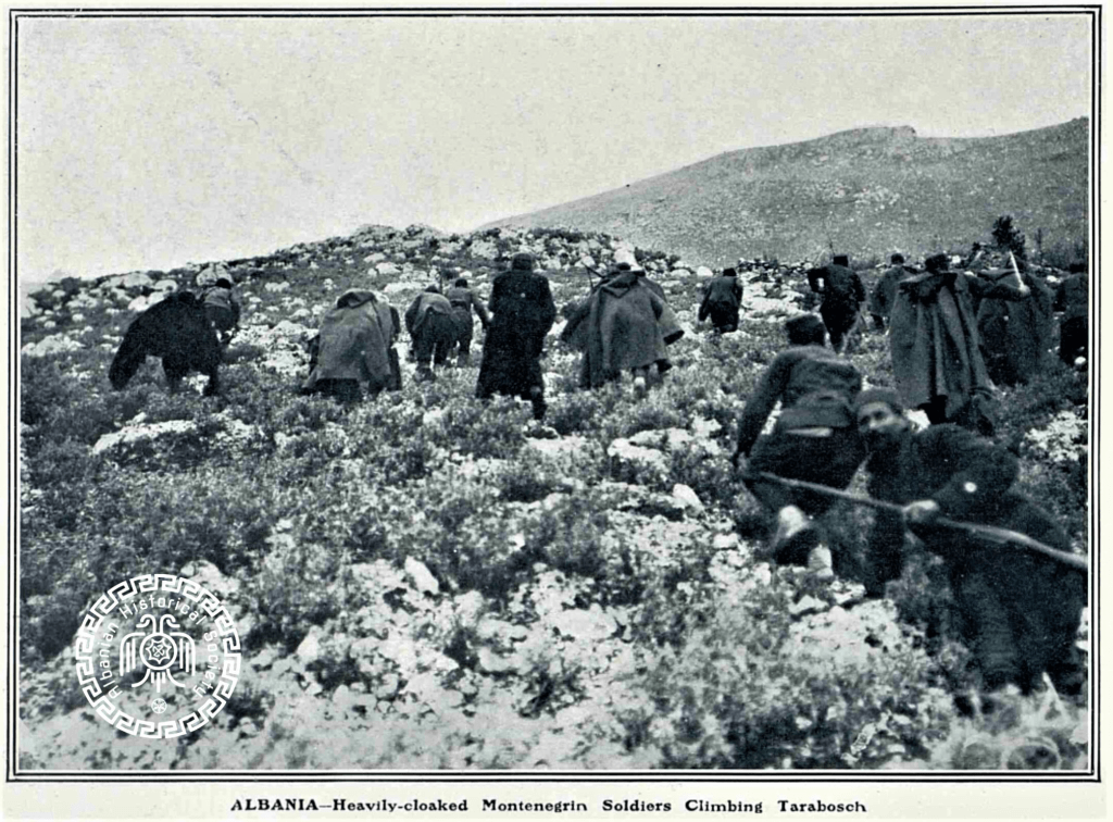 Montenegrin invasion troops climbing the Tarabosh mountain.