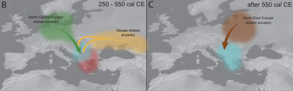 Genetic traces of the invasions that affected the Balkans in the 3rd-7th centuries according to Olade et al 2021.