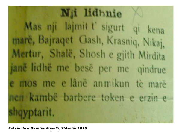 - Populli No. 74, “Lajme t’Mbrendshme,” Shkodër 1915, p. 3.