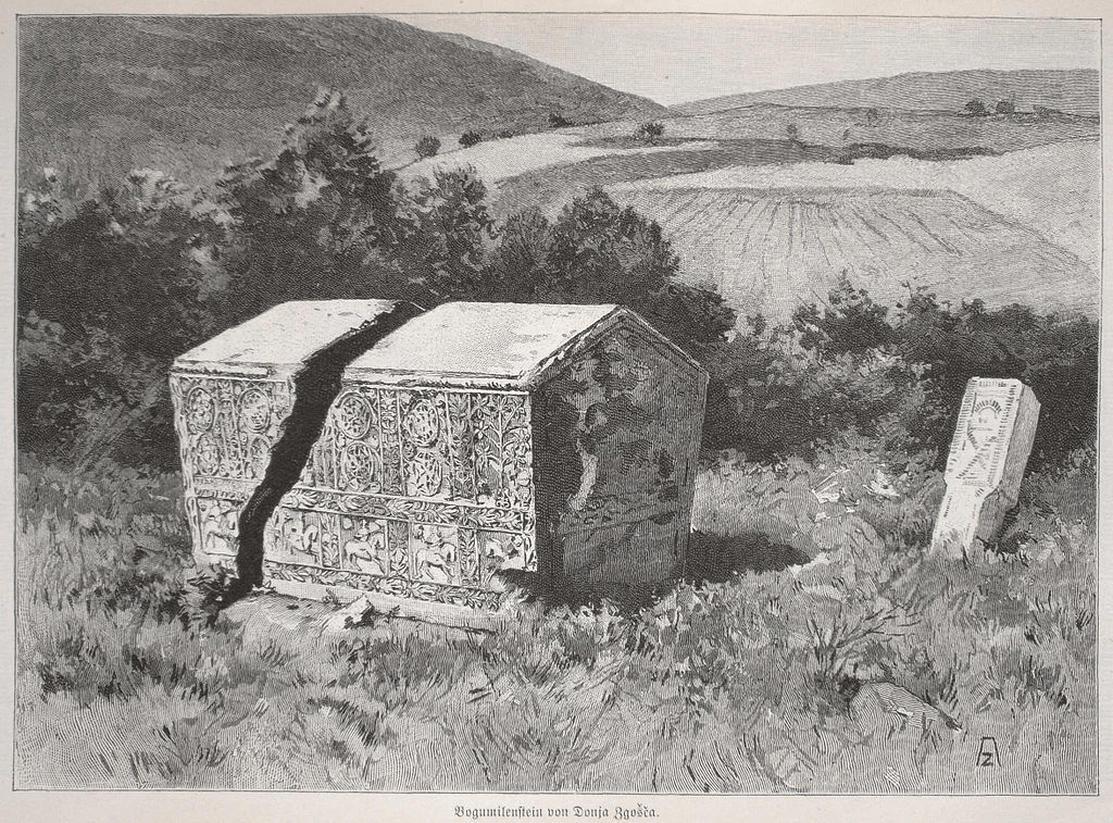 A broken stećak/gravestone described by Hugo Charlemont , 1901. This appears to be the same one now on display in the National Museum of Bosnia and Herzegovina.