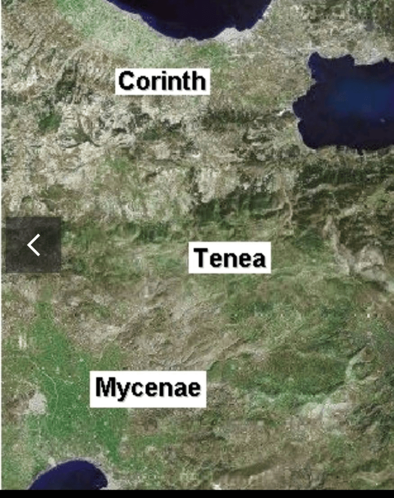 “The city called Tenea is about 60 stadia away (15 kilometers is Tenea today from Corinth based on archaeological excavations, A.V).