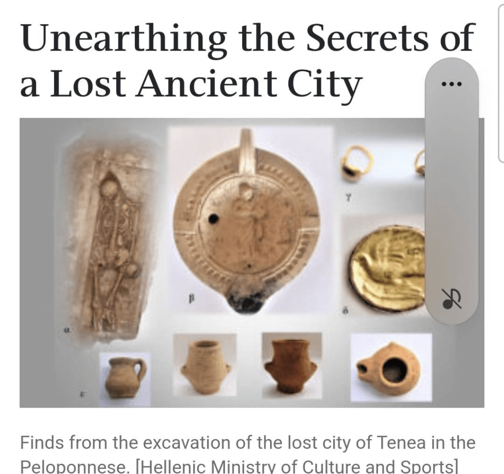 Archaeological excavations led by Dr. Eleni Korka with 40 years of experience brought to light the over 3,000-year-old city of Tenea on the road between Mycenae and Corinth. Tenea is in Corinthia and there is a temple of the Tenean Apollo. It is said that most of the colonists who accompanied Archias (the Corinthian) the leader of the colonists to Syracuse started from Tenea and after this Tenea developed more than the other settlements.